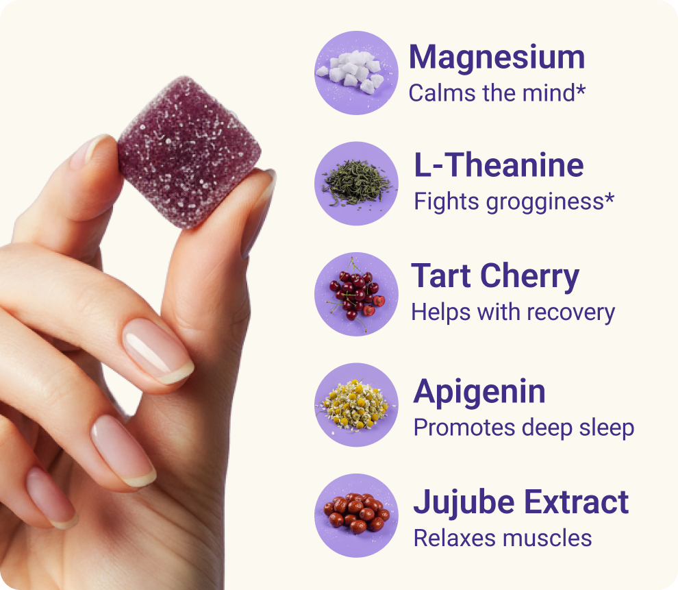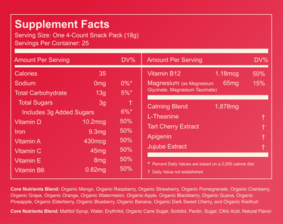 Juicy gummy snack packs combine our most powerful sleep superfoods with essential vitamins and minerals. Snackable, convenient, and bursting with flavor from organic fruits!