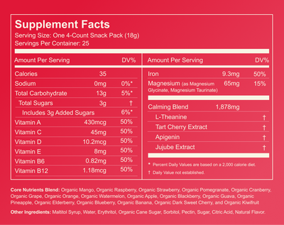Juicy gummy snack packs combine our most powerful sleep superfoods with essential vitamins and minerals. Snackable, convenient, and bursting with flavor from organic fruits!