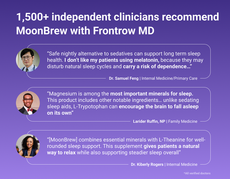 We take your safety seriously, and are proud that MoonBrew is recommended by 1000+ clinicians on Frontrow MD. Our blend is carefully developed to meet the highest standards of safety and efficacy. It’s a supplement that health professionals confidently recommend for better sleep and wellness.