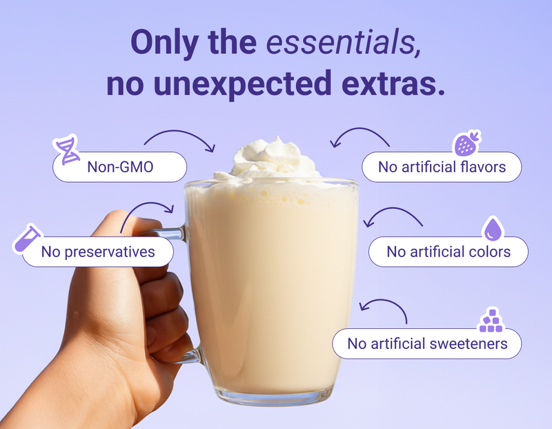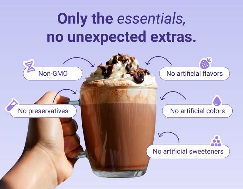 Our Hot Cocoa, Mint Chocolate, and Sleepy Berry flavors are crafted to be deliciously indulgent with natural sweeteners and no sugar.